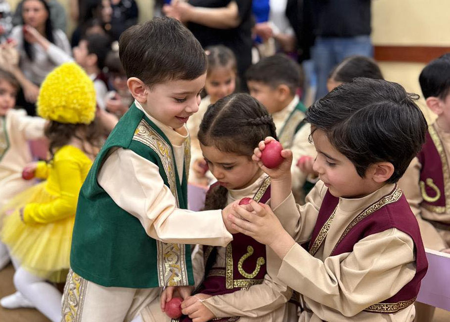 Атмосфера стала праздничной, когда дети начали рассказывать о Святом Воскресении и армянских традициях. Далее начались веселые песни, танцы и декламации, за которыми последовала игра «Битва яйцами», вызвавшая необычайную радость и восторг среди собравшихся в зале.
